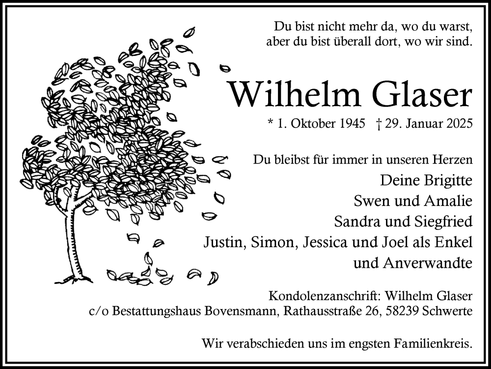 Hier finden Sie alle Traueranzeigen aus der Zeitung, die bisher für Wilhelm Glaser erschienen sind. Weitere Traueranzeigen, die in der Zeitung erscheinen, werden hier ebenfalls aufgelistet