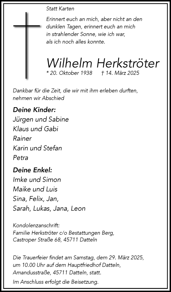 Hier finden Sie alle Traueranzeigen aus der Zeitung, die bisher für Wilhelm Herkströter erschienen sind. Weitere Traueranzeigen, die in der Zeitung erscheinen, werden hier ebenfalls aufgelistet