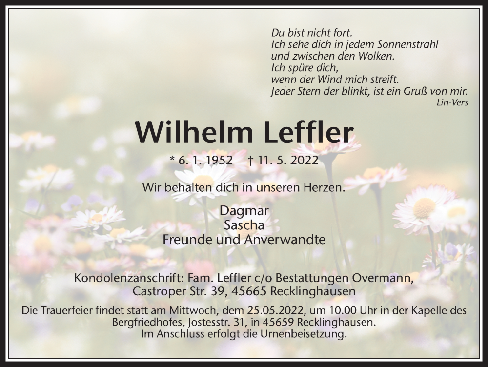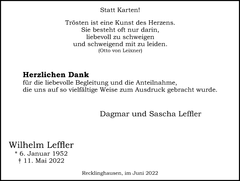 Hier finden Sie alle Traueranzeigen aus der Zeitung, die bisher für Wilhelm Leffler erschienen sind. Weitere Traueranzeigen, die in der Zeitung erscheinen, werden hier ebenfalls aufgelistet
