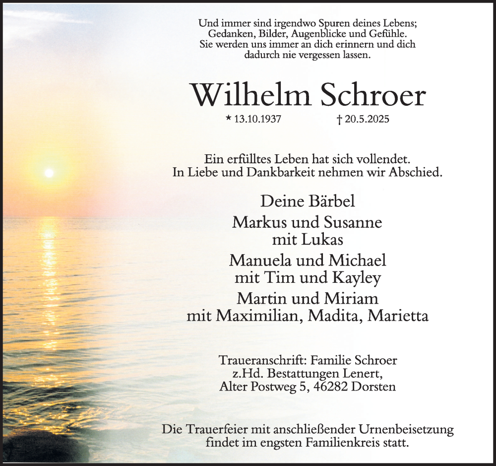 Hier finden Sie alle Traueranzeigen aus der Zeitung, die bisher für Wilhelm Schroer erschienen sind. Weitere Traueranzeigen, die in der Zeitung erscheinen, werden hier ebenfalls aufgelistet
