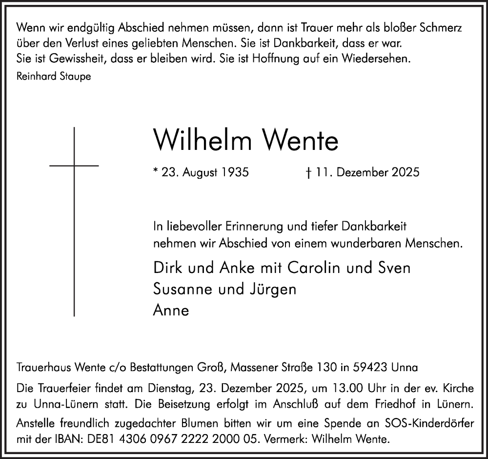 Hier finden Sie alle Traueranzeigen aus der Zeitung, die bisher für Wilhelm Wente erschienen sind. Weitere Traueranzeigen, die in der Zeitung erscheinen, werden hier ebenfalls aufgelistet