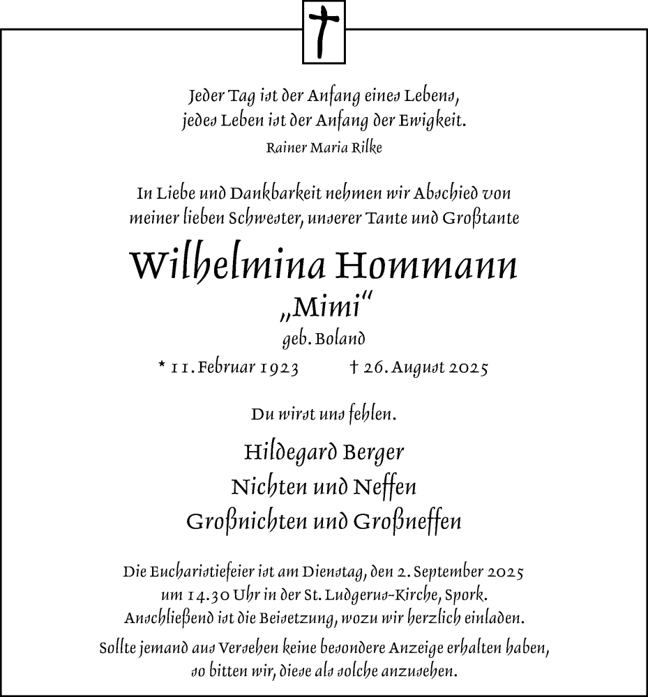Hier finden Sie alle Traueranzeigen aus der Zeitung, die bisher für Wilhelmina Hommann erschienen sind. Weitere Traueranzeigen, die in der Zeitung erscheinen, werden hier ebenfalls aufgelistet