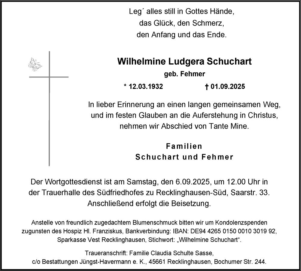 Hier finden Sie alle Traueranzeigen aus der Zeitung, die bisher für Wilhelmine Ludgera Schuchart erschienen sind. Weitere Traueranzeigen, die in der Zeitung erscheinen, werden hier ebenfalls aufgelistet