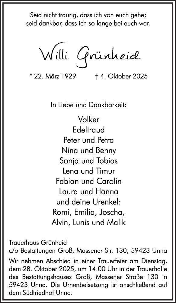 Hier finden Sie alle Traueranzeigen aus der Zeitung, die bisher für Willi Grünheid erschienen sind. Weitere Traueranzeigen, die in der Zeitung erscheinen, werden hier ebenfalls aufgelistet