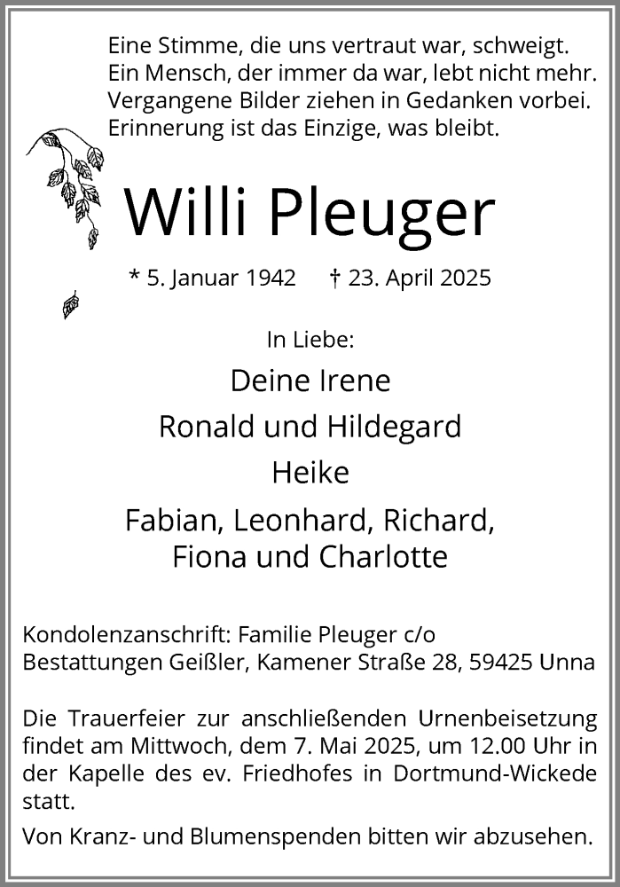 Hier finden Sie alle Traueranzeigen aus der Zeitung, die bisher für Willi Pleuger erschienen sind. Weitere Traueranzeigen, die in der Zeitung erscheinen, werden hier ebenfalls aufgelistet