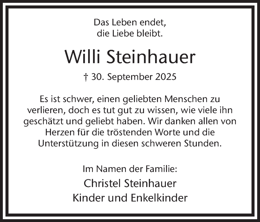 Hier finden Sie alle Traueranzeigen aus der Zeitung, die bisher für Willi Steinhauer erschienen sind. Weitere Traueranzeigen, die in der Zeitung erscheinen, werden hier ebenfalls aufgelistet