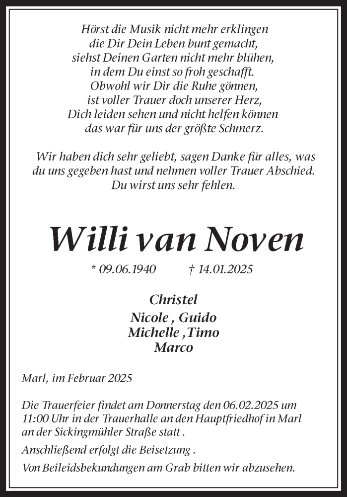 Hier finden Sie alle Traueranzeigen aus der Zeitung, die bisher für Willi van Noven erschienen sind. Weitere Traueranzeigen, die in der Zeitung erscheinen, werden hier ebenfalls aufgelistet
