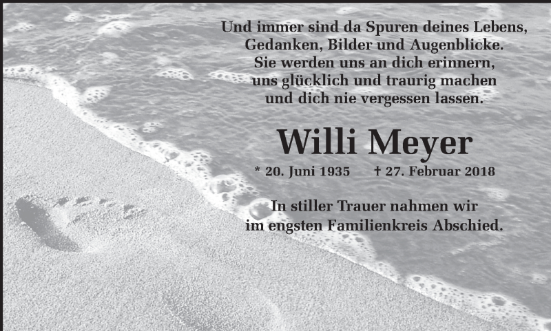 Hier finden Sie alle Traueranzeigen aus der Zeitung, die bisher für Willy Meyer erschienen sind. Weitere Traueranzeigen, die in der Zeitung erscheinen, werden hier ebenfalls aufgelistet