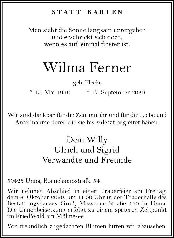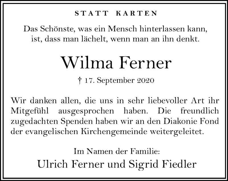 Hier finden Sie alle Traueranzeigen aus der Zeitung, die bisher für Wilma Ferner erschienen sind. Weitere Traueranzeigen, die in der Zeitung erscheinen, werden hier ebenfalls aufgelistet
