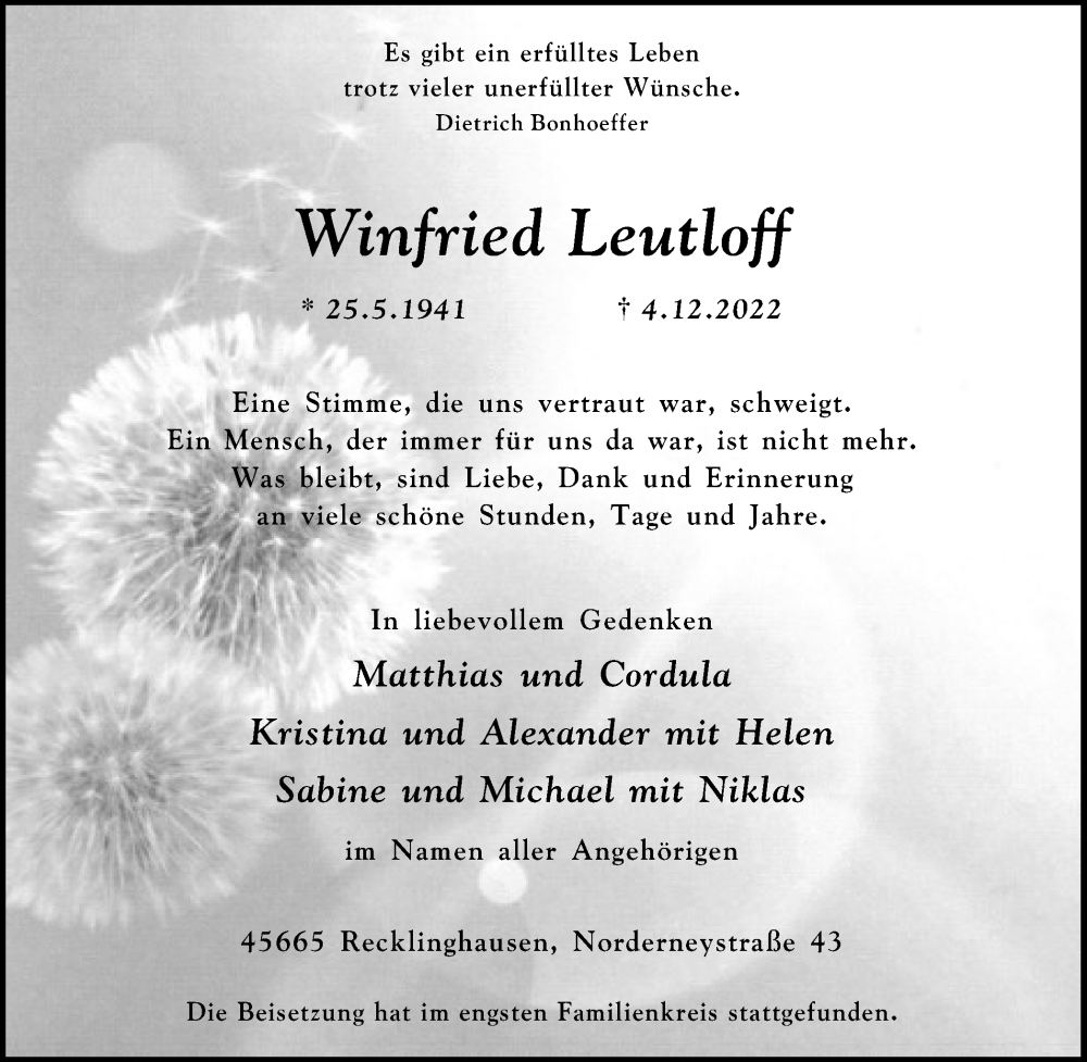 Hier finden Sie alle Traueranzeigen aus der Zeitung, die bisher für Winfried Leutloff erschienen sind. Weitere Traueranzeigen, die in der Zeitung erscheinen, werden hier ebenfalls aufgelistet