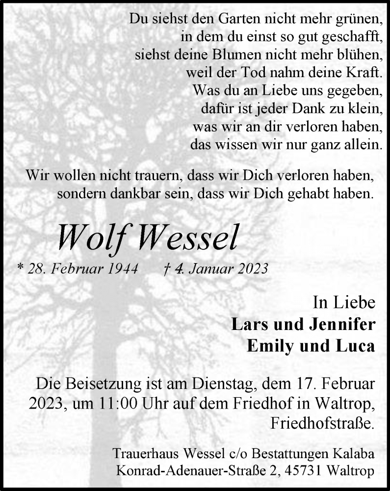 Hier finden Sie alle Traueranzeigen aus der Zeitung, die bisher für Wolf Wessel erschienen sind. Weitere Traueranzeigen, die in der Zeitung erscheinen, werden hier ebenfalls aufgelistet