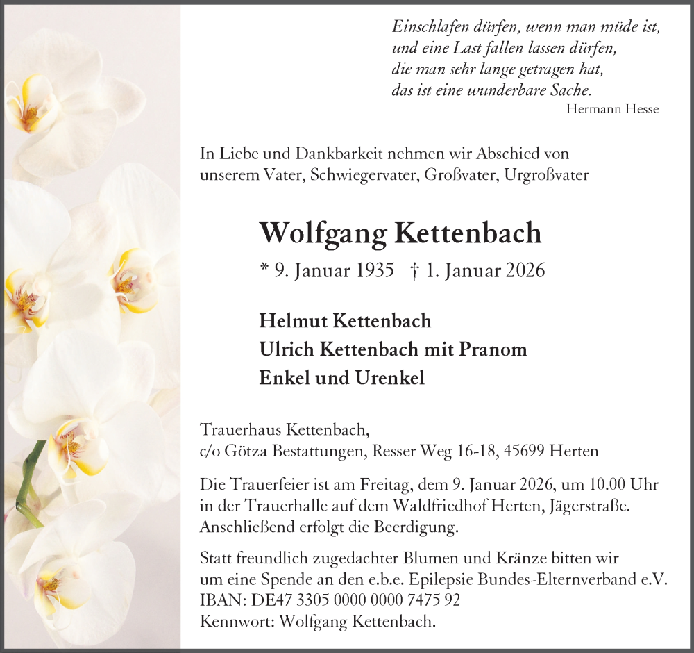 Hier finden Sie alle Traueranzeigen aus der Zeitung, die bisher für Wolfgang Kettenbach erschienen sind. Weitere Traueranzeigen, die in der Zeitung erscheinen, werden hier ebenfalls aufgelistet