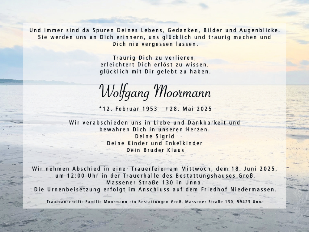 Hier finden Sie alle Traueranzeigen aus der Zeitung, die bisher für Wolfgang Moormann erschienen sind. Weitere Traueranzeigen, die in der Zeitung erscheinen, werden hier ebenfalls aufgelistet