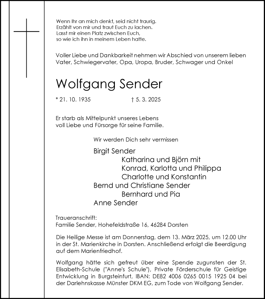 Hier finden Sie alle Traueranzeigen aus der Zeitung, die bisher für Wolfgang Sender erschienen sind. Weitere Traueranzeigen, die in der Zeitung erscheinen, werden hier ebenfalls aufgelistet