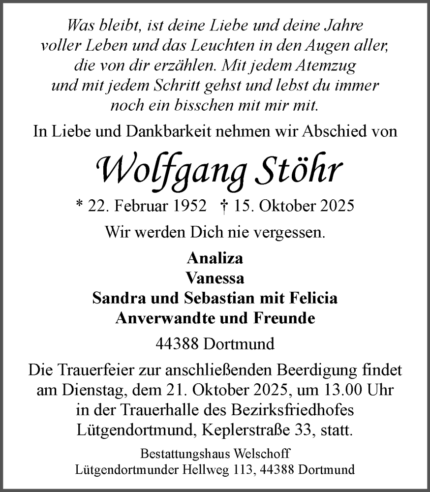 Hier finden Sie alle Traueranzeigen aus der Zeitung, die bisher für Wolfgang Stöhr erschienen sind. Weitere Traueranzeigen, die in der Zeitung erscheinen, werden hier ebenfalls aufgelistet