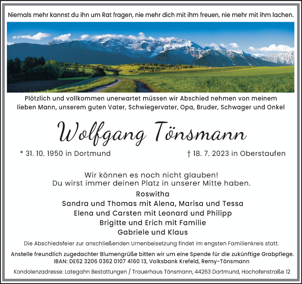 Hier finden Sie alle Traueranzeigen aus der Zeitung, die bisher für Wolfgang Tönsmann erschienen sind. Weitere Traueranzeigen, die in der Zeitung erscheinen, werden hier ebenfalls aufgelistet