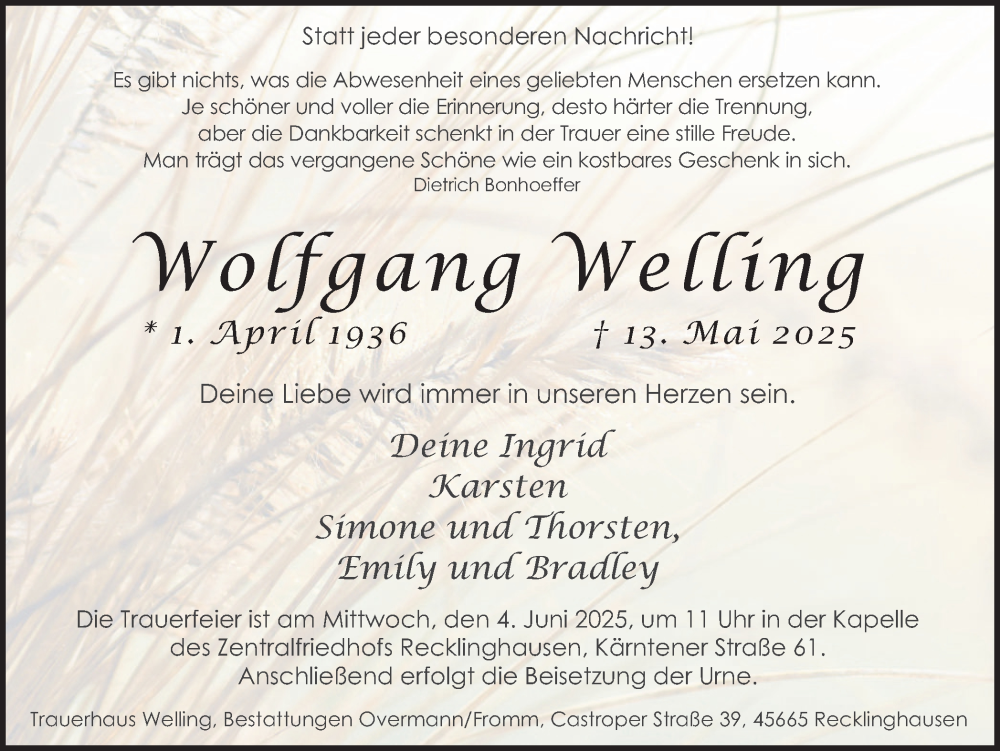 Hier finden Sie alle Traueranzeigen aus der Zeitung, die bisher für Wolfgang Welling erschienen sind. Weitere Traueranzeigen, die in der Zeitung erscheinen, werden hier ebenfalls aufgelistet