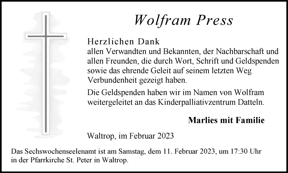 Hier finden Sie alle Traueranzeigen aus der Zeitung, die bisher für Wolfram Press erschienen sind. Weitere Traueranzeigen, die in der Zeitung erscheinen, werden hier ebenfalls aufgelistet