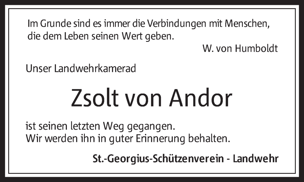 Hier finden Sie alle Traueranzeigen aus der Zeitung, die bisher für Zsolt von Andor erschienen sind. Weitere Traueranzeigen, die in der Zeitung erscheinen, werden hier ebenfalls aufgelistet
